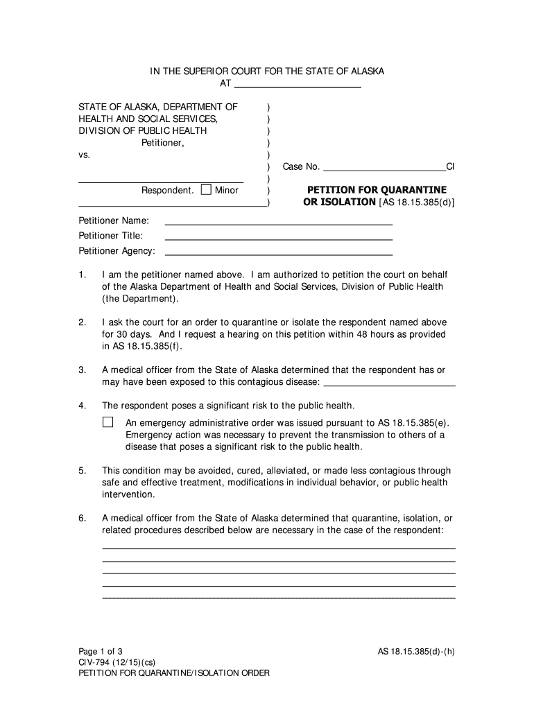 The legal use of the CIV 794 petition is governed by public health laws in Alaska. It is crucial for the petition to adhere to these laws to ensure that the quarantine or isolation measures are enforceable. The petition serves as a formal request to health authorities, and its proper use can facilitate timely and necessary public health interventions. Failure to comply with legal requirements may result in the petition being rejected or challenged.