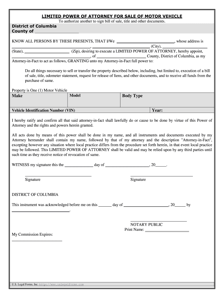 U.S. Legal Forms, Inc. http://www.uslegalforms.com LIMITED POWER OF ATTORNEY FOR SALE OF MOTOR VEHICLE To authorize another to sign bill of sale, title and other documents. District of Columbia County of ____________________ KNOW ALL PERSONS BY THESE PRESENTS, THAT I/We ____________________, whose address is ___________________________________, ____________________ (City), ____________________ (State), ____________________ (Zip), desiring to execute a LIMITED POWER OF ATTORNEY, hereby appoint, ___________________________________, of ______________________ County, District of Columbia, as my Attorney-in-Fact to act as follows, GRANTING unto my Attorney-in-Fact full power to: Do all things necessary to sell or transfer the property described below, including, but limited to, execution of a bill of sale, title, odometer statement, request for release of liens, and other documents, and to receive all funds from the purchase of same. Property is One (1) Motor Vehicle Make Model Body Type Vehicle Identification Number (VIN) Year: I hereby ratify and confirm all that said attorney-in-fact shall lawfully do or cause to be done by virtue of this Power of Attorney and the rights and powers herein granted. All acts done by means of this power shall be done in my name, and all instruments and documents executed by my Attorney hereunder shall contain my name, followed by that of my attorney and the description "Attorney-in-Fact", excepting however any situation where local practice differs from the procedure set forth herein, in that event local practice may be followed. This LIMITED POWER OF ATTORNEY shall be valid and may be relied upon by any third parties until such time as they receive notice of revocation of same. WITNESS my signature this the
