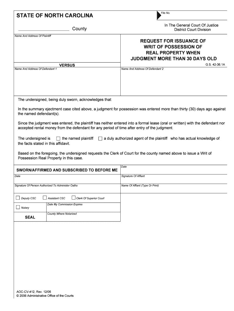 A writ of possession NC form is a legal document issued by a court that allows a landlord to regain possession of a rental property after a tenant has been evicted. This form is essential for landlords in North Carolina to legally reclaim their property. Understanding how to properly fill out and file this form is crucial for a smooth eviction process.